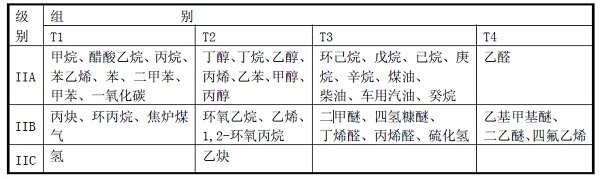 II 類 除煤礦外的其他爆炸性氣體環(huán)境用電氣設備。II 類爆炸性氣體的特性進一步分類為:IIA、IIB、IIC。II 類常見可燃性氣體、蒸氣、溫度組別見下表 II 類 用于除煤礦以外的爆炸性粉塵環(huán)境,III 類再分類:IIIA 類:可燃性飛絮 ; IIIB類:非導電性粉塵;IIIC 類:導電性粉塵;