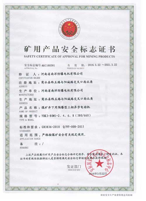 本系列電動機符合 GB755-2008《旋轉電機定額和性能》、企業(yè)標準Q/320206JLAB88-2010《YBK3系列煤礦并下用隔爆硯三相異步電動機技術條件(機座號H100-355)》。其防爆性能符合BG3836.1-2010《爆炸性環(huán)境第1部分:設備通用要求》和GB3826.2-2010《爆炸性環(huán)境第2部分:由隔爆外殼"d"保護的設備》、也符合MT451一l995《煤礦用隔爆型低壓三相異步電動機安全性 能通用技術規(guī)范》的規(guī)定,制成隔爆科ExdI適用于煤礦井下爆炸性氣體環(huán)境的危險場所。也符合IEC79-1,BS4683和EN50018的規(guī)定,制成隔爆型。防爆標識為ExdI Mb,使用有爆炸性氣體混合物存在的場所。ExdI Mb適用于煤礦采掘工作面具有甲烷或煤塵的爆炸性混合物存在的工作環(huán)境。